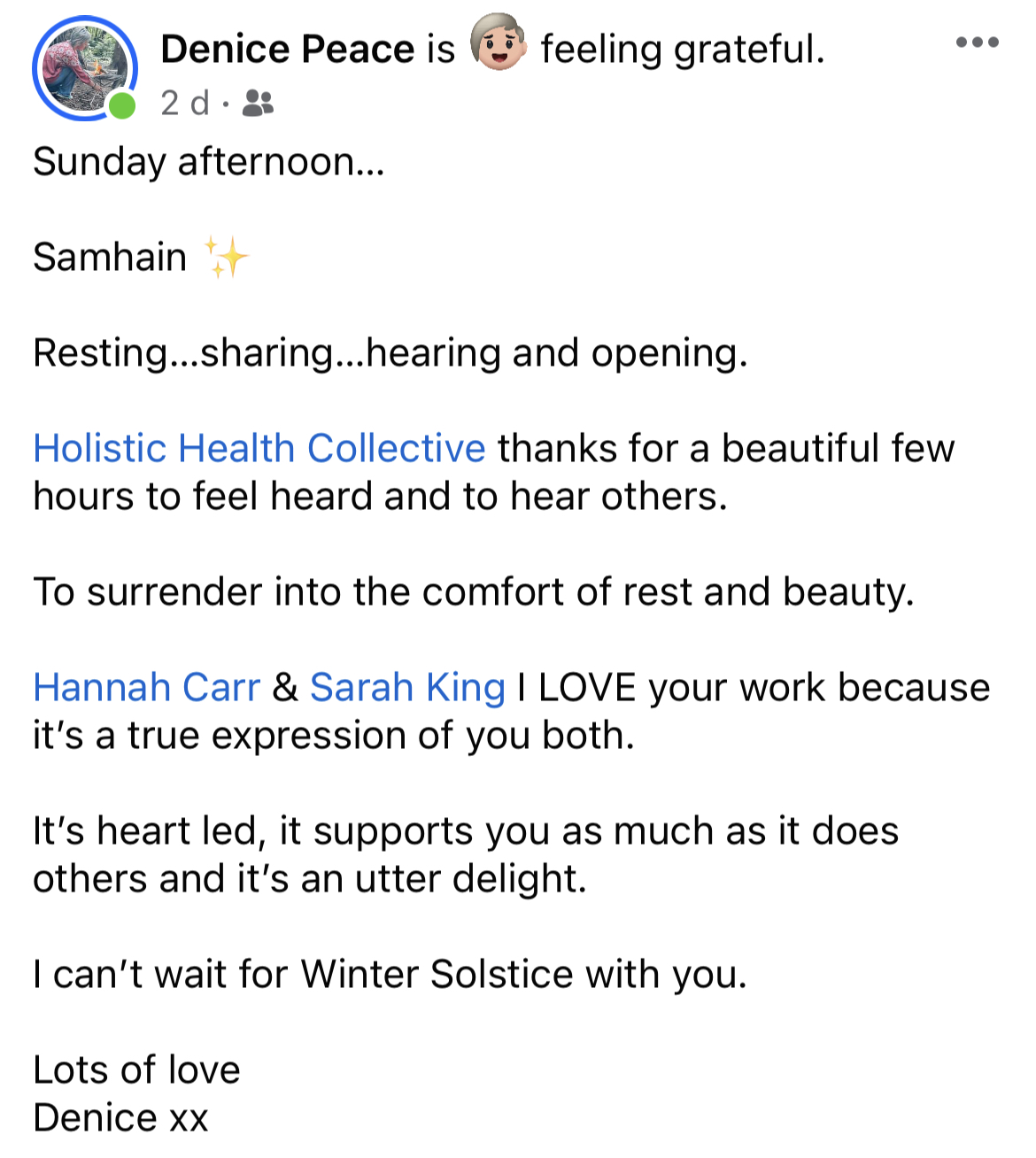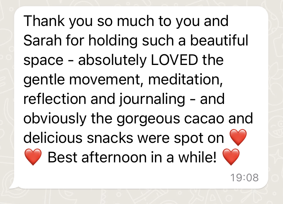 Cacao Ceremony offers you a deeply reflected space that opens a portal into dissolving the fear of letting go and supports following your hearts call so that you hold the vibrations of kindness, unconditional love, and joy, allowing a loving connection with yourself and others.